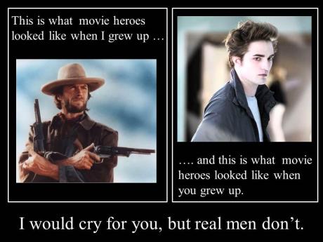 We are a gender-damaged culture that scoffs at the “manliness” of Robert Pattinson when compared to Clint Eastwood based upon heroism and tears.  Surely we could find something more intelligent, more reasonable, to criticize the film about other than the manliness of a tough rugged cowboy archetype versus a brooding sparkly vampire!