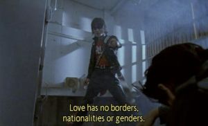 In a sense, Guitar Wolf serves the same role in this movie as The Ramones did in Rock’n’Roll High School . The Ramones were there to be a band but also be a symbol. While Guitar Wolf is a much more active figure within the diegesis than The Ramones were, they serve similar functions. Not only does Guitar Wolf’s look bring up the highly Japanese addiction to the Western rock’n’roll aesthetic, but they are tour guides through the film. One thinks from the several songs that they do, that they would serve a very minor function; that they would simply be there to be the rock stars that Ace sees them as and have a simple performative role. But Takeuchi approaches it differently. Because fan culture is such a large part of Japanese culture, Wild Zero is used to celebrate that aspect of being Japanese but also deconstruct it. While Ace follows the band blindly at first, he learns that there is much to be gotten from their existence that is not received from simple hero-worship. As Ace says in his final voiceover, “From that day on, I never saw a Guitar Wolf show again…Courage and rock’n’roll: that’s what he taught me that night. Love has no boundaries, nationalities, or genders. And he was right.”