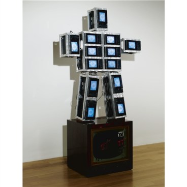 "High Tech Baby" (1987) by Korean artist, Nam Jun Paik, considered to be the "Father of Video Art." 13 5-inch color TV monitors, aluminum, painted wood cabinet and Heart Channel VHS video tape.